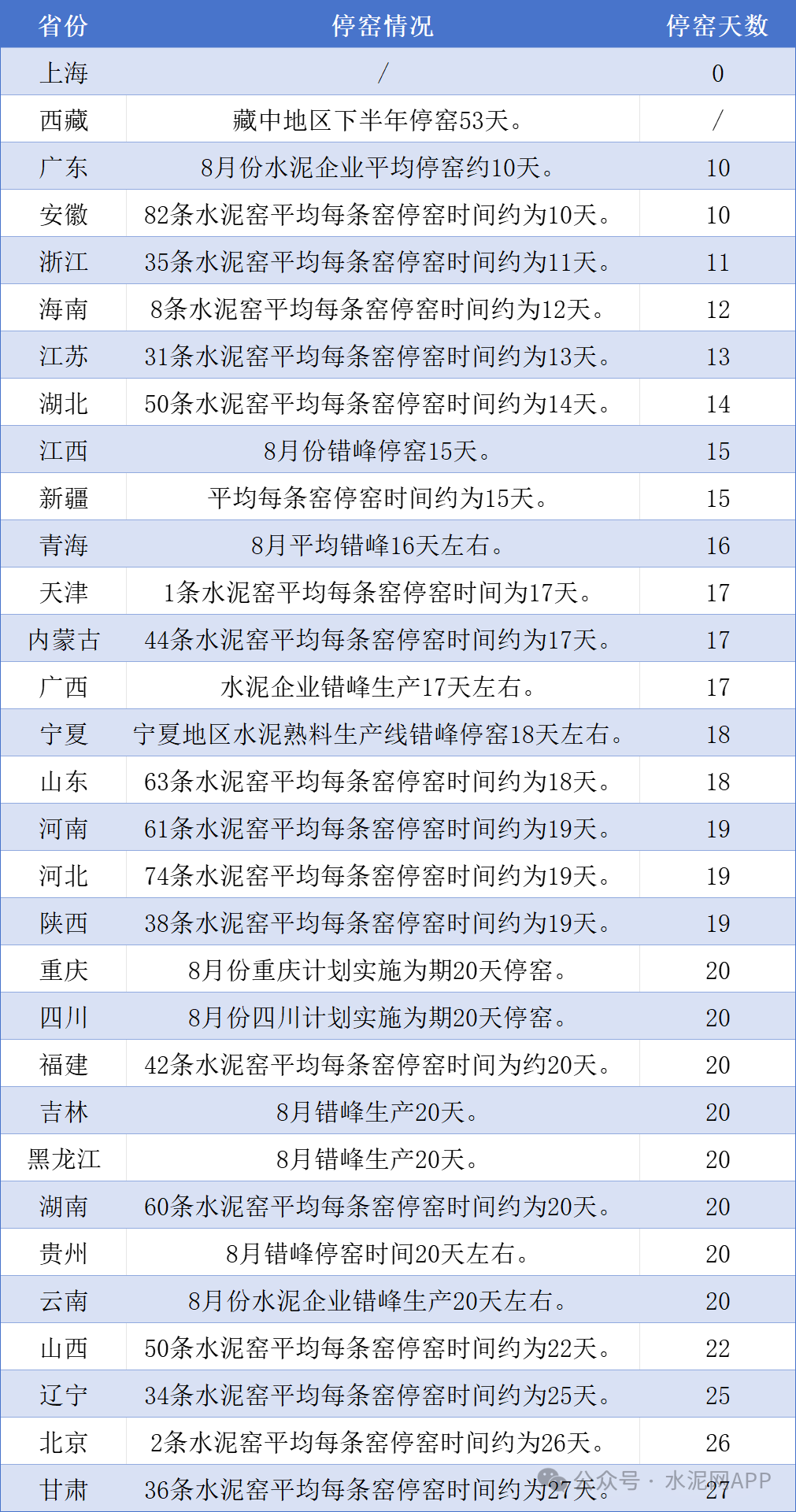 另據(jù)市場反饋,福建地區(qū)水泥企業(yè)計劃9月錯峰停窯18天;河南省水泥企業(yè)8月15號起停窯20天;湖南9月1日-12月31日錯峰生產(chǎn)天數(shù)基數(shù)不少于70天;云南計劃三季度累計停窯50天;東北地區(qū)9月繼續(xù)執(zhí)行錯峰計劃,停窯天數(shù)在15天左右...