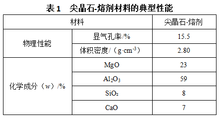 無(wú)碳材料被廣泛應(yīng)用于浸入式水口,原因是它們能在連鑄過(guò)程中抑制耐火材料內(nèi)部產(chǎn)生CO和SiO氣體,通過(guò)限制石墨溶解到鋼水中來(lái)保持工作表面光滑,起到防堵效果。品川公司選用新開發(fā)的無(wú)碳材料——尖晶石-熔劑材料,作為浸入式水口內(nèi)腔材料,選擇尖晶石是因?yàn)榉脚麂撏ǔR?jīng)過(guò)鈣處理,而堿性材料對(duì)這類鋼的抗侵蝕性更好。表1顯示了所用尖晶石-熔劑材料的典型性能。