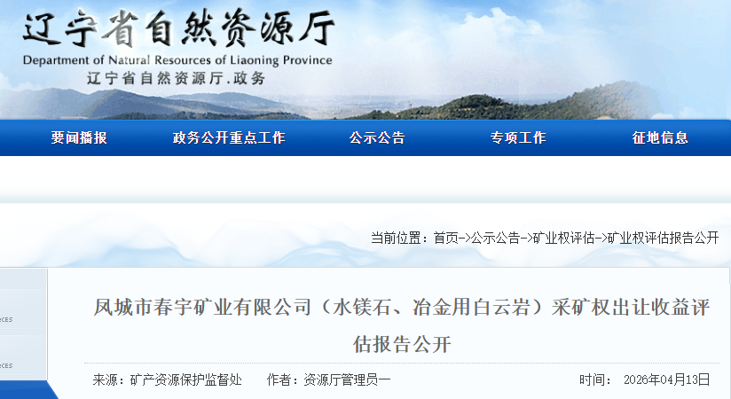 按照《關(guān)于完善礦業(yè)權(quán)出讓收益評估程序的通知》(遼自然資辦發(fā)[2022]2號)要求,《鳳城市春宇礦業(yè)有限公司(水鎂石、冶金用白云巖)采礦權(quán)出讓收益評估報告》及相關(guān)附件已在省自然資源廳網(wǎng)站公示了10個工作日,公示期無異議,現(xiàn)予以公開。